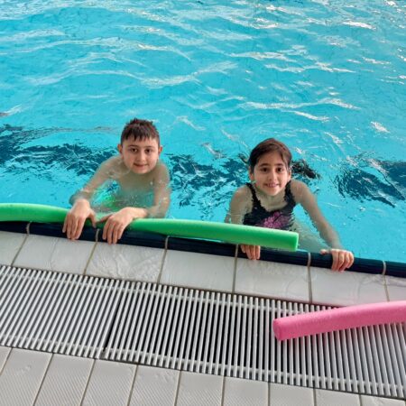 Mit dem Bus ging es am Vormittag gemeinsam zum Hallenbad und nach dem Unterricht wieder zurück zur Schule. Die Vorfreude war groß – und die Motivation im Wasser noch größer!