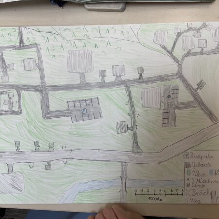 Im Rahmen des Sachunterrichts beschäftigte sich unsere 3b. Klasse mit dem Thema „Pläne und Orientierung“. Ziel war es, dass die Kinder ihre Umwelt bewusst wahrnehmen, vereinfachen und in Form von Plänen darstellen. Dabei entstanden zunächst handgezeichnete Dorf- und Ortspläne, in denen wichtige Elemente wie Straßen, Häuser, Flüsse, Wiesen oder besondere Orte (z. B. Spielplätze oder Geschäfte) eingezeichnet wurden.